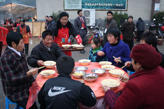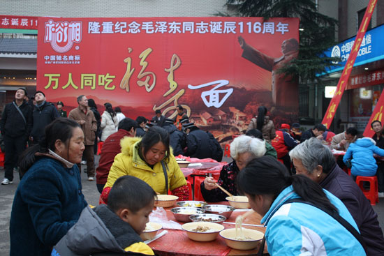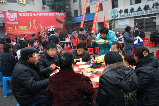 12月26日一大清早,天刚蒙蒙亮,韶山村村部大楼前坪就摆满了八仙桌,韶山村村民和来自全国各地的游客都赶来这里,兴致勃勃地吃上一碗散发着清香的“福寿面”,以这种特殊方式,表达对毛主席最浓厚的思念之情。