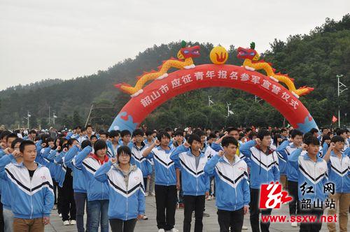 韶山新闻网讯(小余) “我宣誓,积极响应党的号召,自愿报名参军……如被征集入伍,愿到祖国最需要的地方去,到最艰苦的地方去,坚决做到服从命令、听从指挥、努力学习、刻苦训练,争做一名新时期合格军人,为国防和军队现代化建设做贡献,为主席家乡争光添彩。”10月23日上午,韶山市应征青年报名参军宣誓仪式在毛泽东广场举行。340余名青年怀着十分激动的心情,高举右手,在伟大领袖毛主席铜像前庄严宣誓。