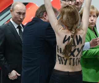 当地时间4月8日,普京与德国总理默克尔在汉诺威工业博览会参观“大众汽车”公司展位时,突然跑出数名女子,她们脱去上衣,赤裸上身并用英文高喊不文明口号。普京发表声明说,乌克兰FEMEN女权组织积极分子在博览会赤裸上身高喊口号的行为并不令他反感,“但讨论政治问题最好还是穿上衣服”。