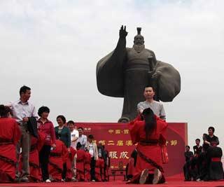 5月1日,在西安汉长安城遗址外的汉城湖景区,近40名年轻人身着汉服,仿照古代习俗举行了自己的成人礼,吸引了大量游人驻足围观。