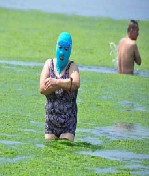 2013年7月3日,山东青岛青岛高温来袭,“青岛大妈”不惧浒苔,戴着“强盗面具”出现在海水浴场消暑降温。